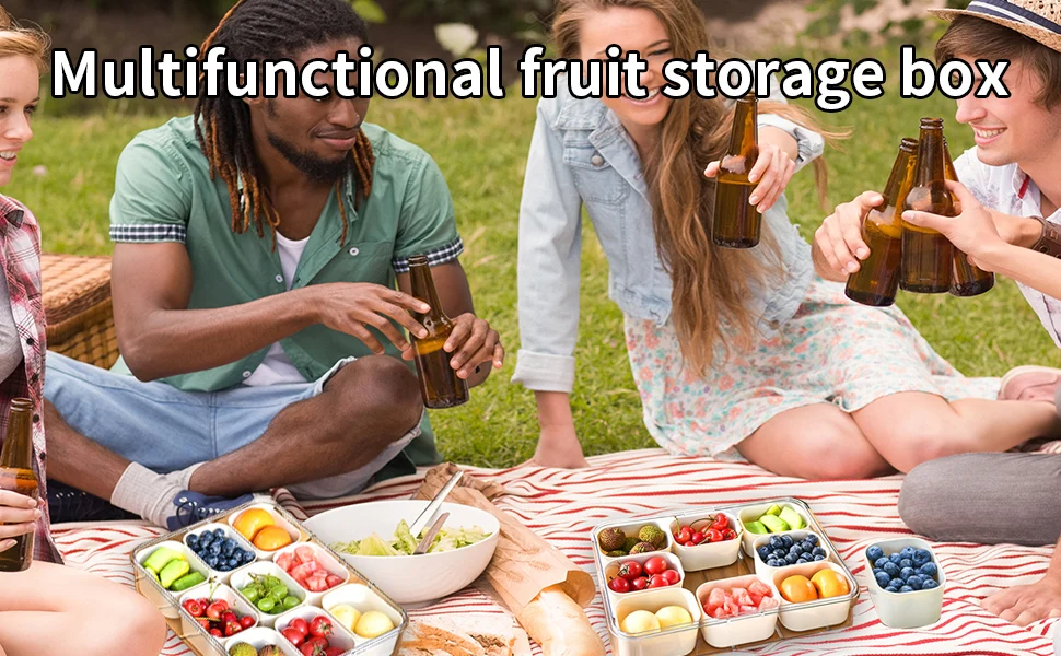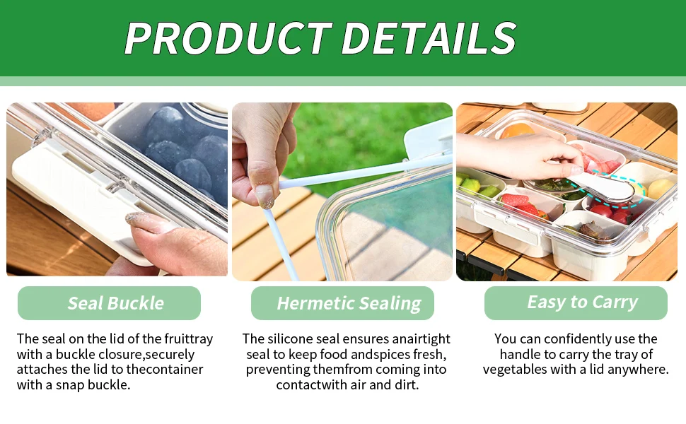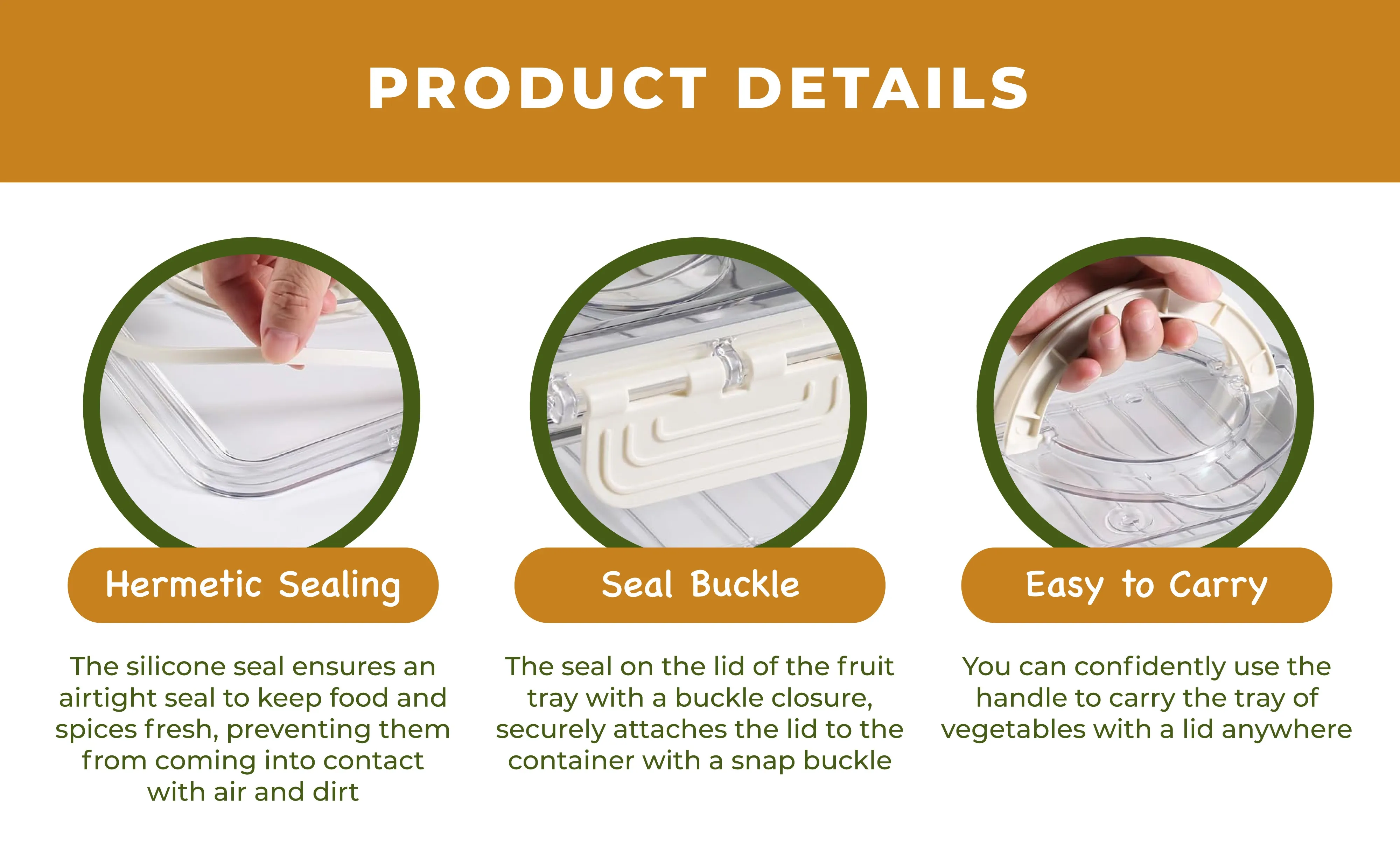 【Upgraded Sealing Ring and Handle Design】: The fruit tray has a silicone ring and four buckles to lock in freshness on all four sides. The double-layer design of the sealing ring prevents food odor from leaking out and air from entering, which helps to better maintain the freshness of food. The inner basket and outer box can be detached and used separately, and the top of the box is designed with a handle for easy lifting and moving.