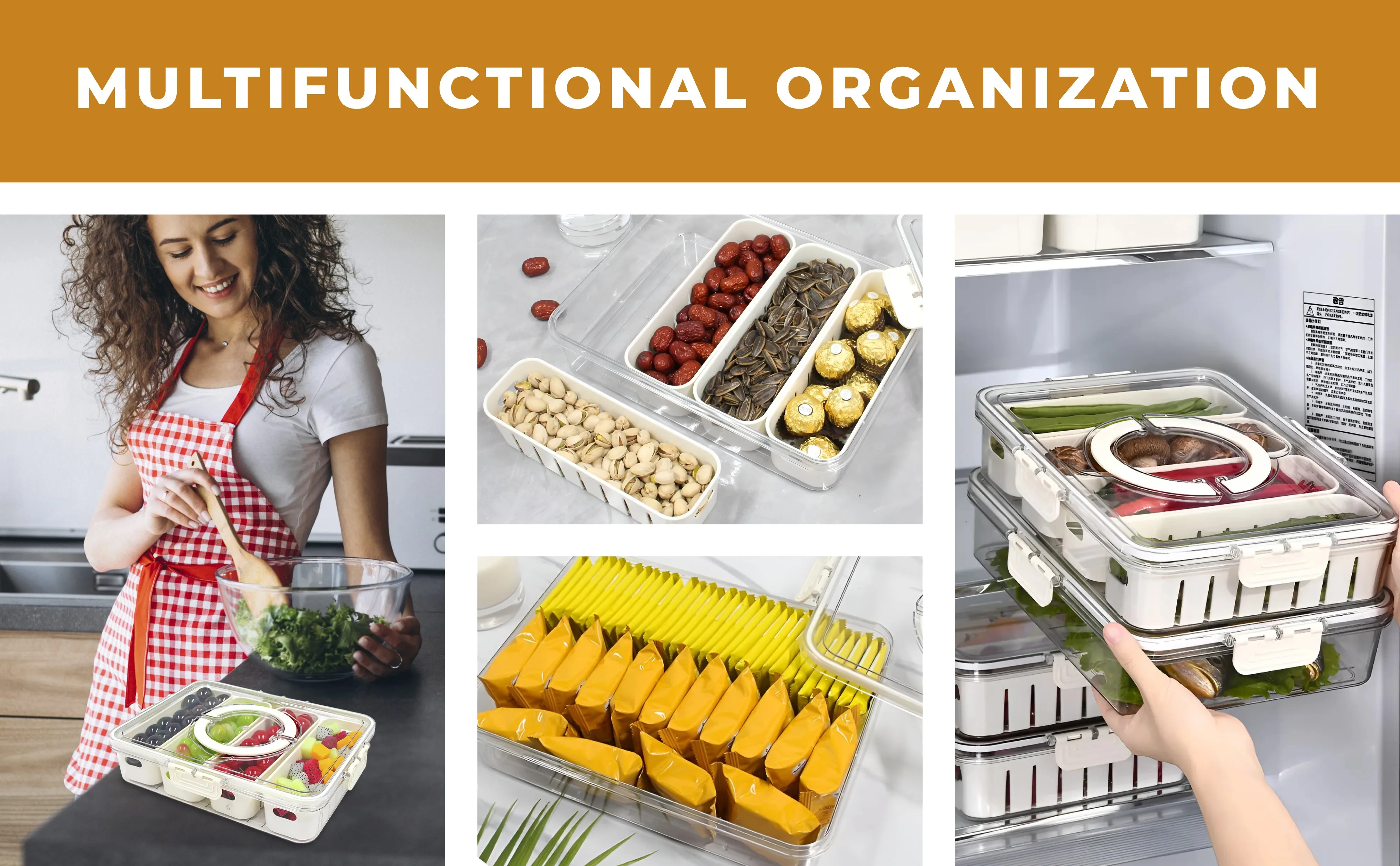 【Saying goodbye to clutter, food stays fresh locked】: Fruit and vegetable storage containers allow food to be stacked and stored in one step, with covered storage to bid farewell to clutter. It can be stored in the refrigerator to keep food fresh and organized. It can hold fruits, vegetables, candies, snacks, seasonings, dried fruits, etc., allowing you to mix and match as you please.